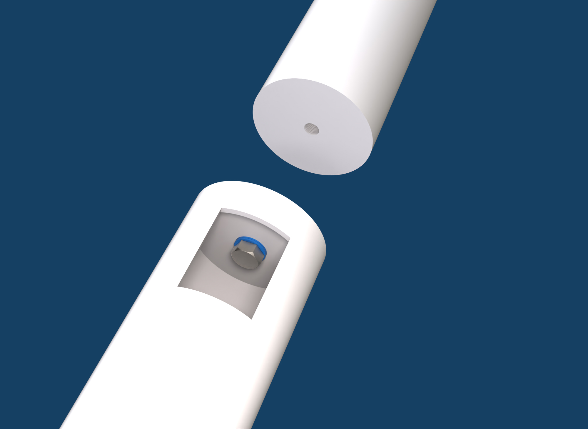 近距离观察屋顶结构中的盲孔连接。在空心部分的另一侧,螺栓连接锚定在实心材料结构上,而不是另一个空心部分。